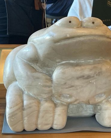 Alabaster. Frog being, made to combine the coqui with Dia de Los Muetros. The skull of the loved one is being held by the frog.